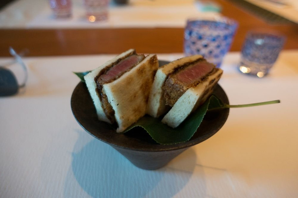 Bữa tối có giá khoảng 395 USD một người, có thể lên tới 500-600 USD nếu tính thêm tiền đồ uống và thuế. Thực khách được thưởng thức thực đơn 10 món thay đổi hàng ngày. Món bánh mì kẹp tonkatsu này gồm thịt lợn tẩm bánh mì rán giòn ướp sốt nâu kiểu Pháp.